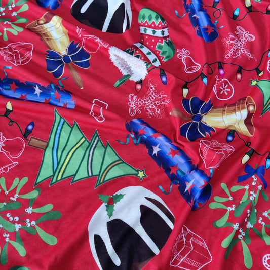 FS778 Christmas Pudding Spun Polyester Jersey Knit Stretch Fabric Red