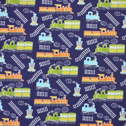 FS771_1 Train Track Poly Cotton Fabric Navy
