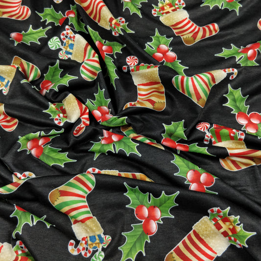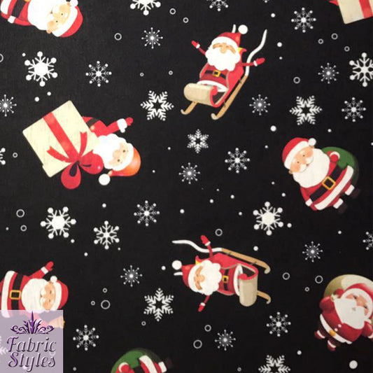 FS074 Christmas Print, Santa, Snowflakes, Sledge, Presents Spun Polyester Knit Stretch Fabric Black