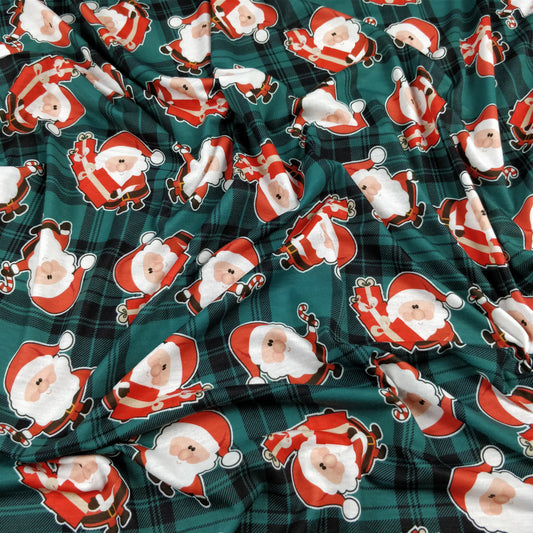 FS079_2 Christmas Tartan Santa Spun Polyester Jersey Knit Stretch Fabric Green