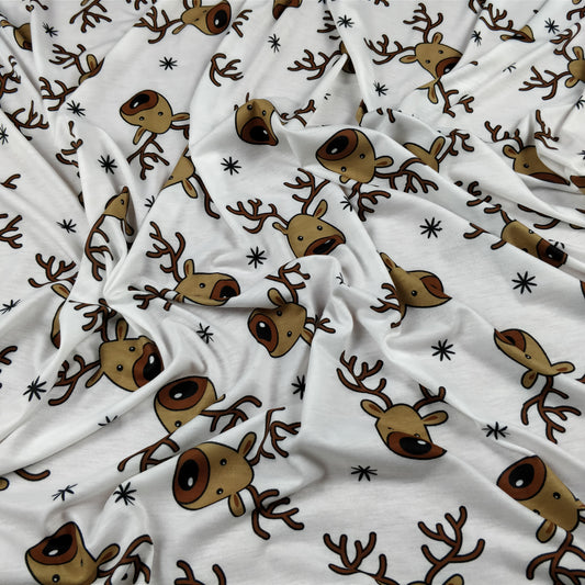 FS073_1 Christmas Rudolf Reindeer Spun Polyester Jersey Knit Stretch Fabric White