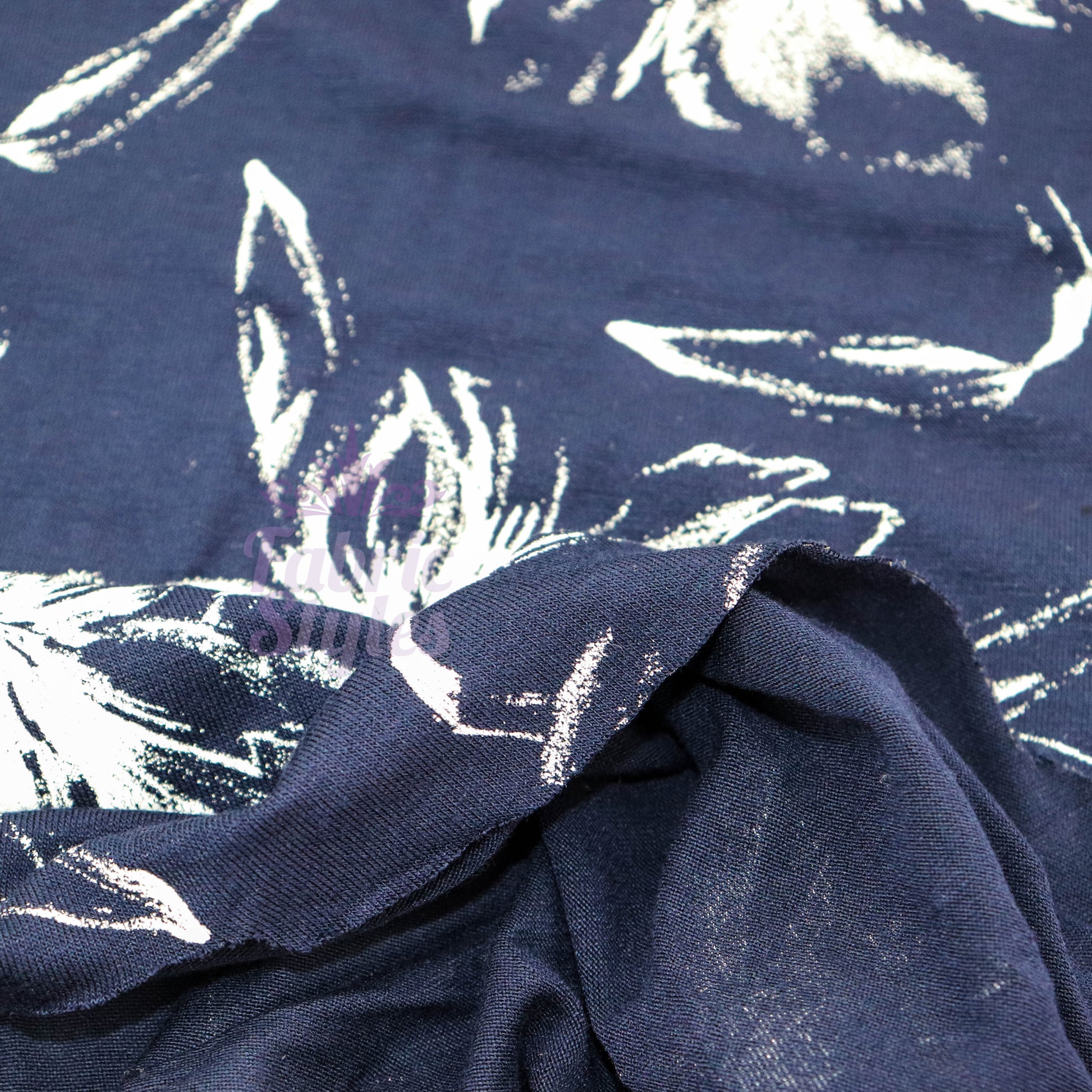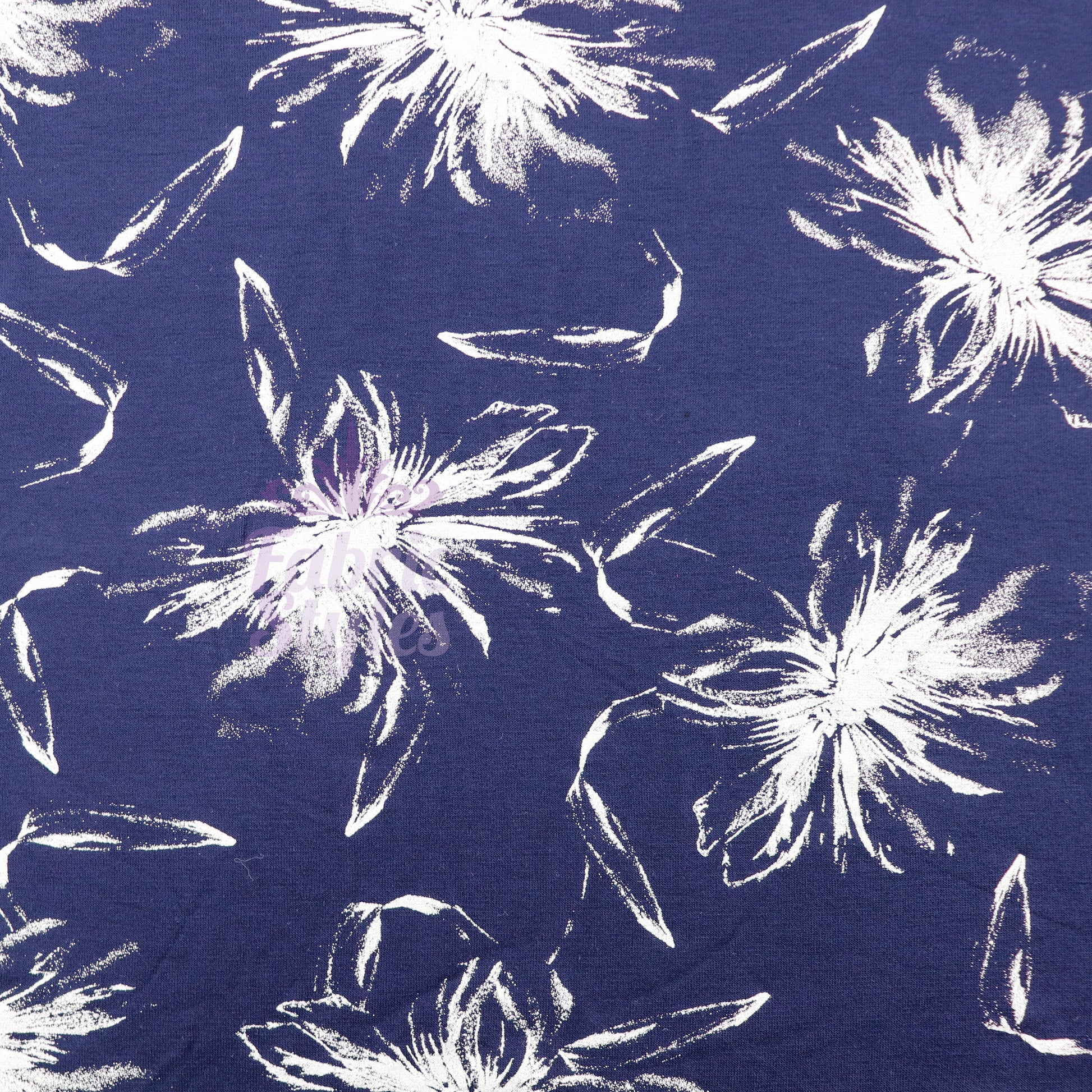 Navy Vintage Floral White Stencil Viscose Elastane Fabric